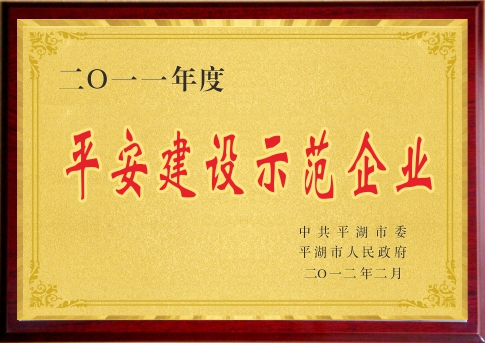 繼集團公司被嘉興市社會治安綜合治理委員會命名為“2011-2012年度示范綜治工作站 ”稱號后, 日前,我集團公司又被平湖市人民政府授予“2011年度平安建設(shè)示范企業(yè)”榮譽稱號。