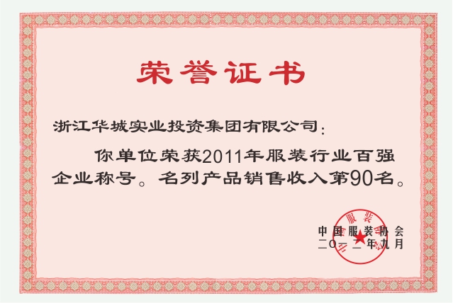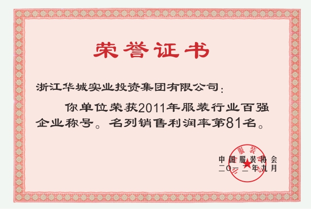 華城集團作為平湖服裝行業(yè)的骨干企業(yè),不僅排列于平湖服裝行業(yè)十強之列,而且在今年九月發(fā)布的全國服裝行業(yè)百強企業(yè)排序中,浙江華城實業(yè)投資集團有限公司連續(xù)榜上有名,再次榮獲2011年全國服裝行業(yè)百強企業(yè)榮譽稱號,名列產(chǎn)品銷售收入第90名;利潤總額第90名;銷售利潤率第81名,共三項殊榮,成為嘉興地區(qū)唯一能連續(xù)榮獲全國服裝行業(yè)百強的企業(yè),再次顯示了華城集團努力拼搏的成功與輝煌,值得為此而驕傲。華城能連續(xù)多年保持中國服裝百強企業(yè),創(chuàng)下企業(yè)發(fā)展史上前所未有的佳績,榮譽實為來之不易,尤其是在目前全球經(jīng)濟形勢依然嚴峻,市場需求大幅萎縮,不穩(wěn)定因素不斷增多的不利環(huán)境下。這是全體華城員工在董事長的正確領(lǐng)導(dǎo)下,同心同德、奮力拼搏、努力奉獻共同取得的成果。華城人始終堅信服裝企業(yè)生命力的長短來于理念,效益的高低在于管理。我們?nèi)A城從小到大、從弱到強能如此充滿生機與活力,再一次證明了先進的企業(yè)文化是企業(yè)生存和發(fā)展的內(nèi)在動力。文化凝聚人心,文化是動力之源,文化是企業(yè)提升核心競爭力的靈魂。企業(yè)形象靠企業(yè)文化來塑造,企業(yè)聲譽靠企業(yè)文化來傳播,企業(yè)素質(zhì)靠企業(yè)文化來提高,企業(yè)精神靠企業(yè)文化來培育,企業(yè)品牌靠企業(yè)文化來宣傳。華城企業(yè)文化的形成與發(fā)展,標志著企業(yè)已由企業(yè)經(jīng)營正走向經(jīng)營企業(yè)的進程。