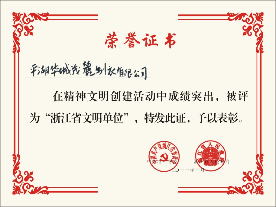 中共浙江省委、浙江省人民政府在2011年1月21日下發(fā)了浙委[2011]8號文件,通報(bào)命名表彰了一批浙江省示范文明城市、文明社區(qū)、文明單位和文明鎮(zhèn)。平湖華城茂麓制衣有限公司榜上有名,被命名為“浙江省文明單位”。