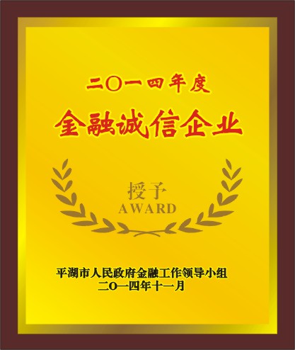 為進(jìn)一步推進(jìn)落實(shí)“信用平湖”建設(shè)工作,構(gòu)建良好銀企環(huán)境,促進(jìn)經(jīng)濟(jì)持續(xù)健康發(fā)展,平湖市人民政府金融工作領(lǐng)導(dǎo)小組組織開展了“金融誠(chéng)信企業(yè)”評(píng)選活動(dòng),我公司被授予“2014年度金融誠(chéng)信企業(yè)”光榮稱號(hào)。