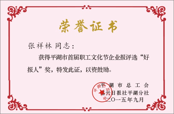 為促進(jìn)企業(yè)報(bào)發(fā)展,推動(dòng)企業(yè)文化建設(shè),日前,平湖市總工會(huì)與嘉興日報(bào)社平湖分社聯(lián)合舉辦了平湖市首屆職工文化節(jié)暨企業(yè)報(bào)“三好”評選活動(dòng),我公司董事長張祥林榮獲平湖市首屆職工文化節(jié)企業(yè)報(bào)評選“好報(bào)人”稱號(hào)。