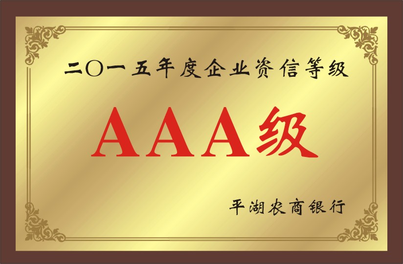 企業(yè)資信等級一等資信狀況包括三個資信級別,即AAA級、AA級和A級。“AAA”表示企業(yè)經(jīng)營處于良性循環(huán)狀態(tài),資產(chǎn)質(zhì)量優(yōu)良,經(jīng)營業(yè)績好,支付能力很強,信譽極好,清償能力非常強,風(fēng)險最小,是資信等級中的最高級別。我公司近日又獲平湖農(nóng)商銀行2015年度AAA級企業(yè)資信等級證書。