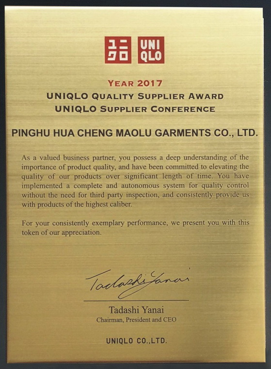 2017年2月底,迅銷(xiāo)集團(tuán)公布了全球146家供應(yīng)商名單,其中中國(guó)88家,我公司就是其中最優(yōu)秀的供應(yīng)商之一!白非笠涣鞯目蛻(hù),生產(chǎn)頂尖的世界品牌。”這是我公司的企業(yè)經(jīng)營(yíng)目標(biāo),F(xiàn)R正是這樣的好客戶(hù)。圍繞客戶(hù)需求,了解客戶(hù)理念,在與FR合作的十九年里,我公司始終用最優(yōu)秀的理念培養(yǎng)最優(yōu)秀的員工,生產(chǎn)最優(yōu)質(zhì)的產(chǎn)品,提供最貼心的服務(wù),與客戶(hù)共同奮斗,共同成長(zhǎng)。感謝FR客戶(hù)提供給我們的廣闊天地,感謝我們每一位員工作出的每一份努力和貢獻(xiàn)。