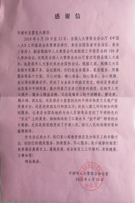 來自全國各省市自治區(qū)、省會(huì)(首府)副省級(jí)城市人大常委會(huì)代表聯(lián)絡(luò)工作委員會(huì)的100人參加會(huì)議。這既是全國人大常委會(huì)辦公廳首次安排縣級(jí)人大承辦,也是我市人大首次承辦全國性會(huì)議。圣雷克大酒店的出品和服務(wù)獲得與會(huì)代表的一致贊譽(yù)和與會(huì)各方的高度肯定。近日,酒店還收獲了來自平湖市人大常委會(huì)辦公室的表揚(yáng)信。