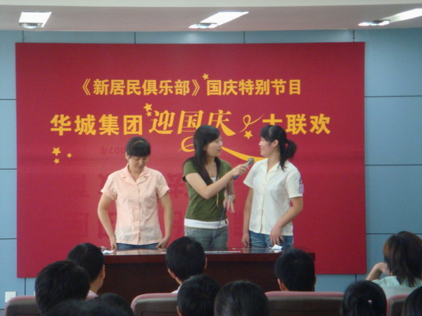 為了慶祝中華人民共和國建國五十九周年,平湖電視臺(tái)生活頻道“生活1+1”欄目組聯(lián)合華城集團(tuán)工會(huì)、集團(tuán)團(tuán)總支于9月25日在華城集團(tuán)總部共同舉辦一期名為“新居民俱樂部,迎國慶大聯(lián)歡”的主題活動(dòng)。公司工會(huì)主席沈文英、《華城報(bào)》總編凌中強(qiáng)等領(lǐng)導(dǎo)參加此次活動(dòng),本次活動(dòng)邀請(qǐng)華城集團(tuán)下屬五個(gè)分公司員工代表前來參加。
