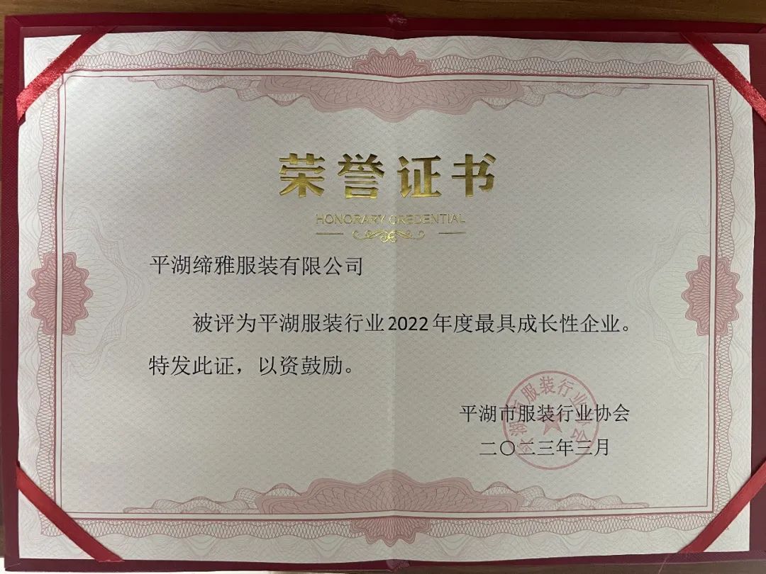 平湖締雅服裝有限公司榮獲“2022年度最具成長性企業(yè)”榮譽稱號。