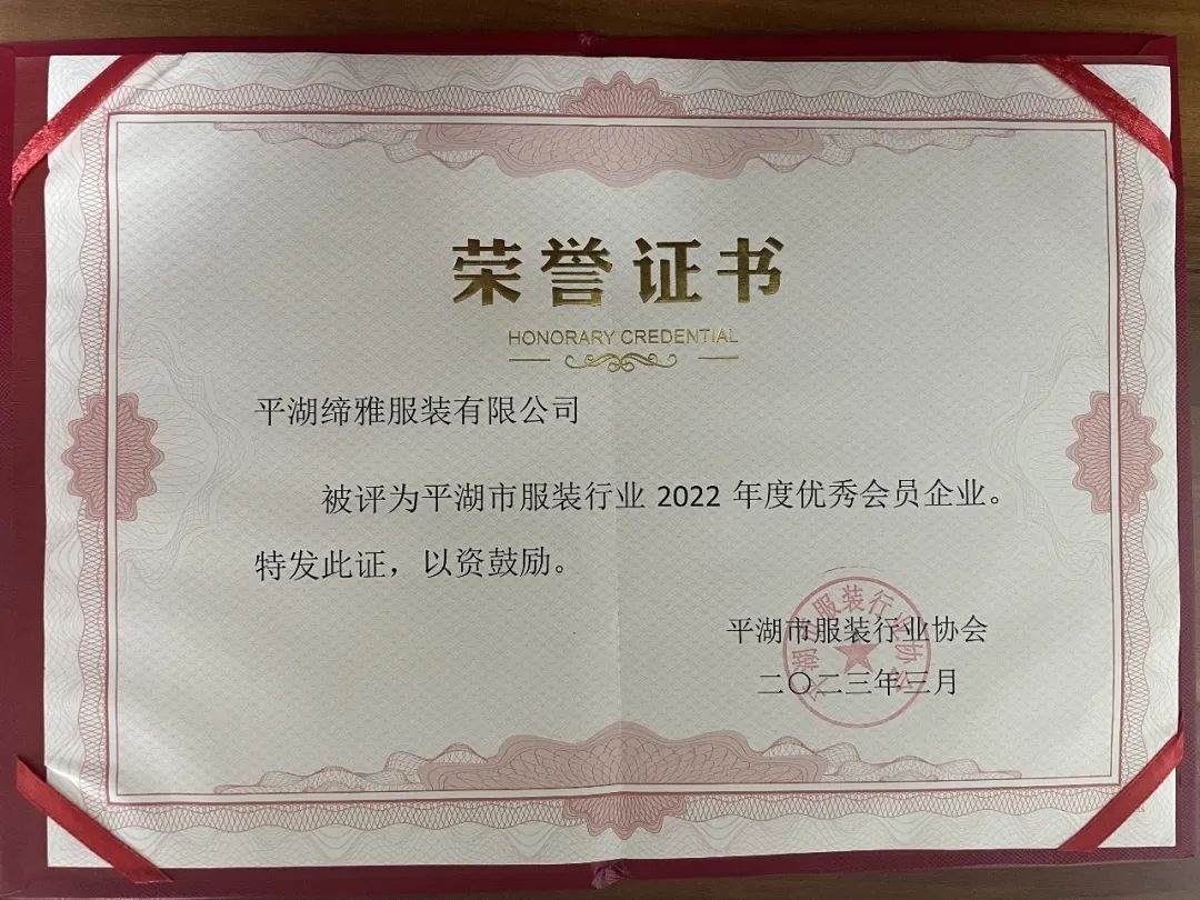 平湖締雅服裝有限公司榮獲“2022年度優(yōu)秀會員企業(yè)”榮譽稱號。
