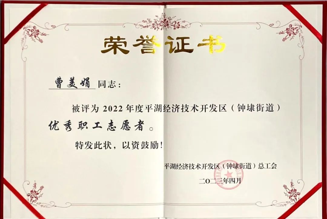 平湖華城茂麓制衣有限公司員工曹美娟榮獲“2022年度平湖經(jīng)濟(jì)技術(shù)開(kāi)發(fā)區(qū)(鐘埭街道)優(yōu)秀職工志愿者”稱號(hào);