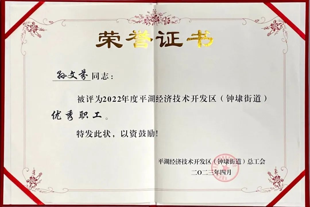 平湖市華城制衣股份有限公司員工孫文芬榮獲“2022年度平湖經(jīng)濟(jì)技術(shù)開(kāi)發(fā)區(qū)(鐘埭街道)優(yōu)秀職工”稱號(hào);