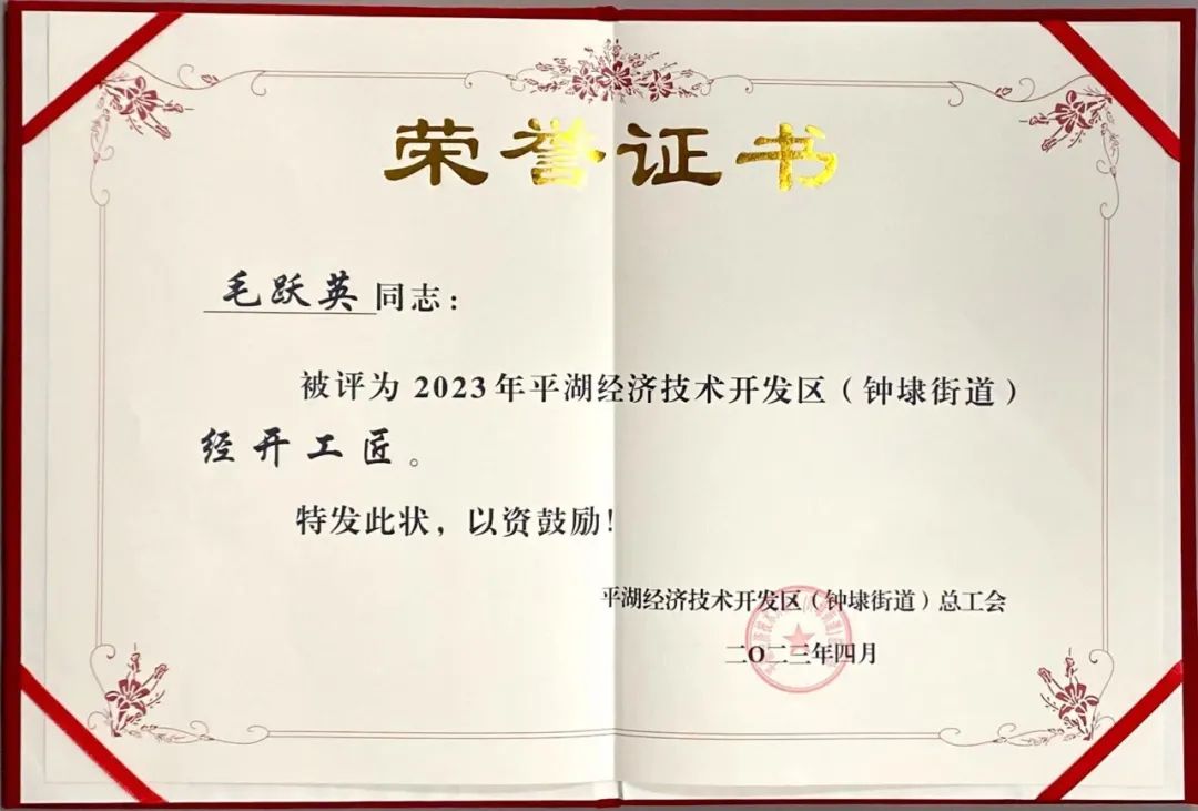 平湖華城茂麓制衣有限公司員工毛躍英榮獲“2023年平湖經(jīng)濟(jì)技術(shù)開(kāi)發(fā)區(qū)(鐘埭街道)經(jīng)開(kāi)工匠”稱號(hào)。