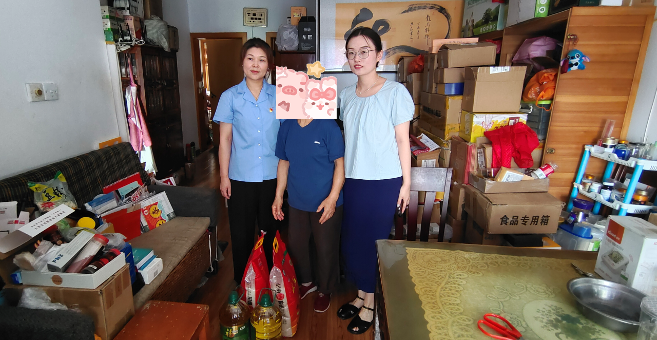 最后一站,西林寺東區(qū)孤老熊女士家里。熊女士丈夫今年去世,領(lǐng)養(yǎng)的兒子是殘疾人,是社區(qū)比較關(guān)注的特殊群體之一。當看到社區(qū)和企業(yè)送上門來的油和米,熊女士非常感動,這也極大地增加了她對生活的樂觀心情。